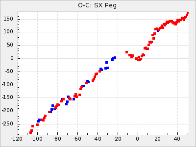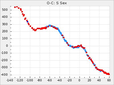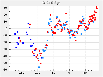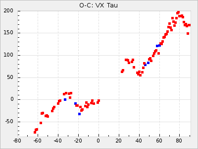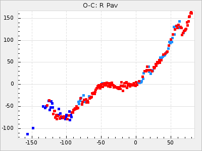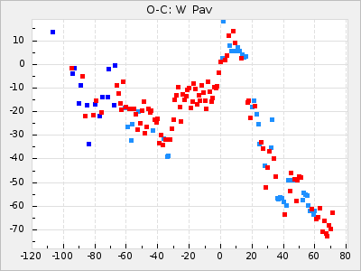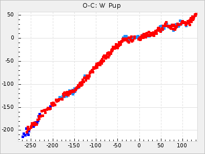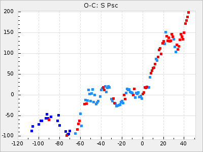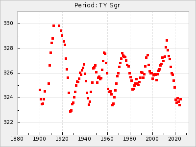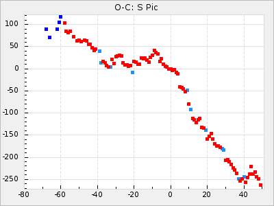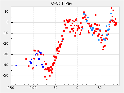 Mean period: 326.10, Mean epoch: 2445367.9 LC Avg Per ΔP: -4.82 ±0.08 (t:64.2, r2:0.967), ΔEpoch: -50.1 ΔP/C: -0.031 ±0.003 (t:9.7, r2:0.403) Mag at max: 8.3 ±0.2 (7.9-8.7) GCVS period: 330.92, GCVS epoch: 2445418 GCVS spectral type: M6e-M8e E/P (X=15) ε2: 117.5, 2a2: -238, r2: 0.978 E/P (X=5) ε2: 63, 2a2: -39.1, r2: 0.972 |