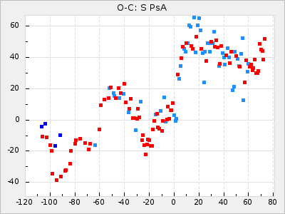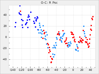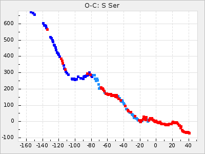 Mean period: 452.09, Mean epoch: 2439303.9 LC Avg Per ΔP: 1.68 ±0.12 (t:14.2, r2:0.687), ΔEpoch: 53.9 ΔP/C: 0.037 ±0.007 (t:5.3, r2:0.234) Mag at max: 9.4 ±0.7 (8.5-11.2) GCVS period: 450.41, GCVS epoch: 2439250 GCVS spectral type: M4e-M9(Se) E/P (X=15) ε2: 145.2, 2a2: -184.6, r2: 0.991 E/P (X=5) ε2: 90.1, 2a2: -17.4, r2: 0.916 |