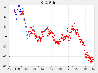 The 7th and 8th row is the result of the Eddington/Plakidis test. Before the test is made the linear component of the diagram is removed and is then done with X<=15 and X<=5. This test is to see if the changes in the O-C is likely due to small random cycle-to-cycle fluctuations or a real change of the period. See Irregularities of period of long-period variable stars for more information about this test. In short ε is the average random error in the period and a is the average error in determine the time for maximum. The star falls outside the test if the term 2a2 have a big negative value and could be a sign of real period changes.