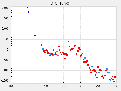 Mean period: 331.62, Mean epoch: 2441463.0 LC Avg Per ΔP: -2.33 ±0.05 (t:42.9, r2:0.953), ΔEpoch: 8 ΔP/C: 0.017 ±0.002 (t:9.2, r2:0.486) Mag at max: 8.8 ±0.4 (8.1-9.6) GCVS period: 333.95, GCVS epoch: 2441455 GCVS spectral type: M5e-M6e E/P (X=15) ε2: 41, 2a2: -39.2, r2: 0.949 E/P (X=5) ε2: 24, 2a2: 22.9, r2: 0.97 |