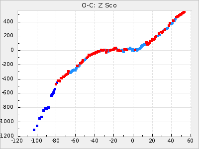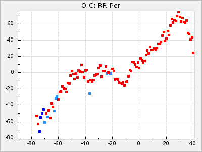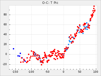 Mean period: 416.82, Mean epoch: 2445162.6 LC Avg Per ΔP: -7.98 ±0.18 (t:43.7, r2:0.955), ΔEpoch: -14.4 ΔP/C: -0.039 ±0.013 (t:3.1, r2:0.099) Mag at max: 8.9 ±0.3 (8.4-9.3) GCVS period: 424.8, GCVS epoch: 2445177 GCVS spectral type: M6e-M7e E/P (X=15) ε2: 459.2, 2a2: -896.1, r2: 0.984 E/P (X=5) ε2: 269.2, 2a2: -267, r2: 0.966 |