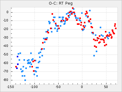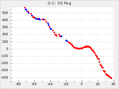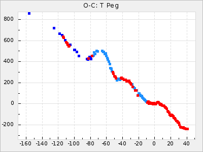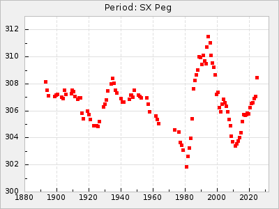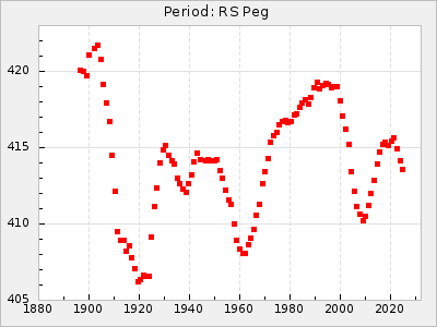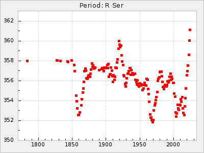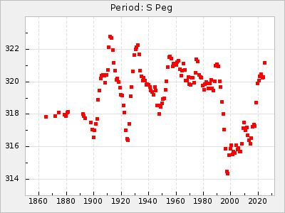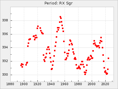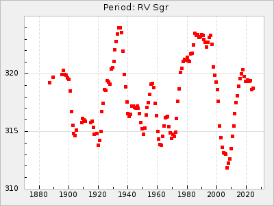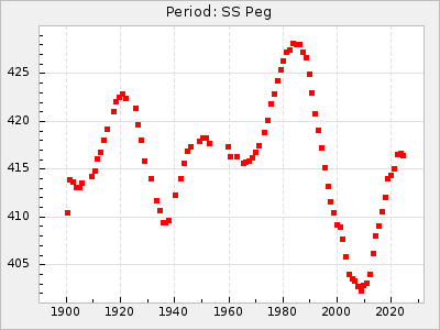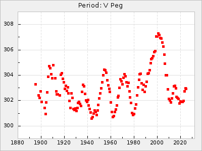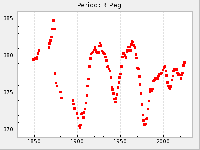 Mean period: 366.57, Mean epoch: 2439911.8 LC Avg Per ΔP: -4.18 ±0.2 (t:20.9, r2:0.794), ΔEpoch: -68.2 ΔP/C: -0.053 ±0.01 (t:5.3, r2:0.198) Mag at max: 8.7 ±0.4 (7.5-9.6) GCVS period: 370.75, GCVS epoch: 2439980 GCVS spectral type: M4/6e-M7II-IIIe E/P (X=15) ε2: 470.4, 2a2: -1084.2, r2: 0.975 E/P (X=5) ε2: 226.9, 2a2: -208.2, r2: 0.975 |