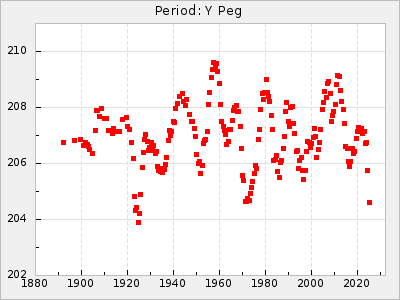 Mean period: 240.92, Mean epoch: 2441439.7 LC Avg Per ΔP: 0.21 ±0.02 (t:8.8, r2:0.287), ΔEpoch: 7.7 ΔP/C: 0.01 ±0.001 (t:19.1, r2:0.66) Mag at max: 9.1 ±0.6 (7.7-10.3) GCVS period: 240.71, GCVS epoch: 2441432 GCVS spectral type: M3e-M5II-Ibe E/P (X=15) ε2: 8.6, 2a2: 24.8, r2: 0.979 E/P (X=5) ε2: 6.2, 2a2: 34.2, r2: 0.699 |