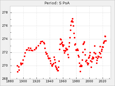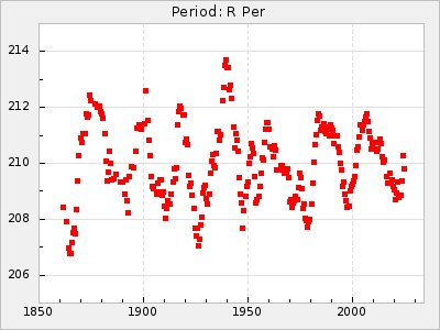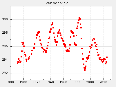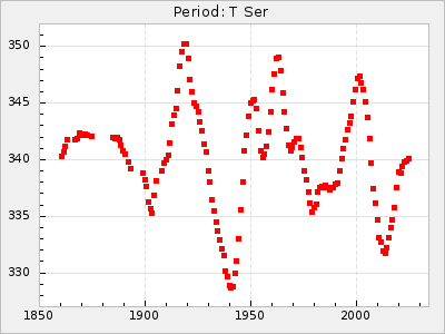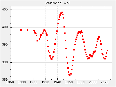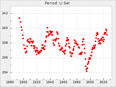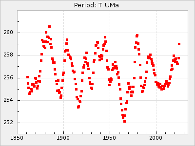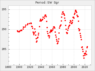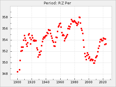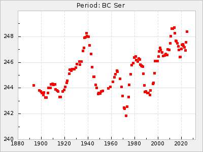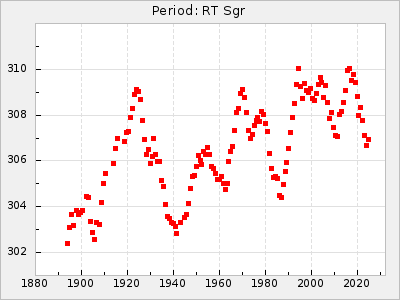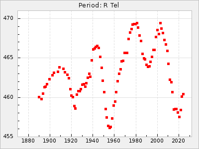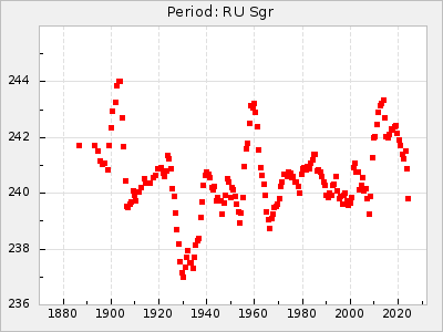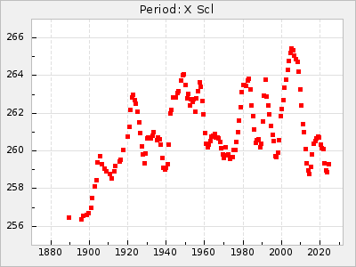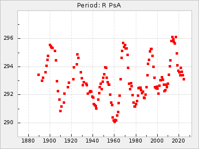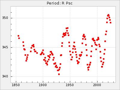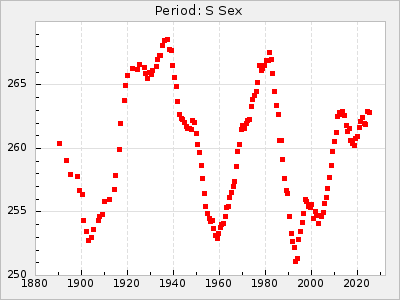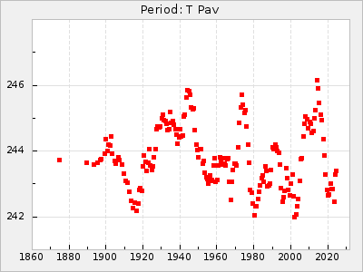 Mean period: 260.15, Mean epoch: 2445316.6 LC Avg Per ΔP: -4.75 ±0.1 (t:47.9, r2:0.935), ΔEpoch: -73.4 ΔP/C: -0.03 ±0.003 (t:9.4, r2:0.359) Mag at max: 9.3 ±0.4 (8.2-10.8) GCVS period: 264.9, GCVS epoch: 2445390 GCVS spectral type: M2e-M5e E/P (X=15) ε2: 246.3, 2a2: -602, r2: 0.963 E/P (X=5) ε2: 101.3, 2a2: -69.1, r2: 0.959 |