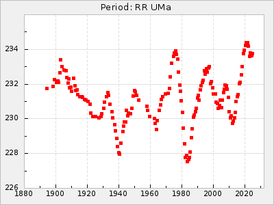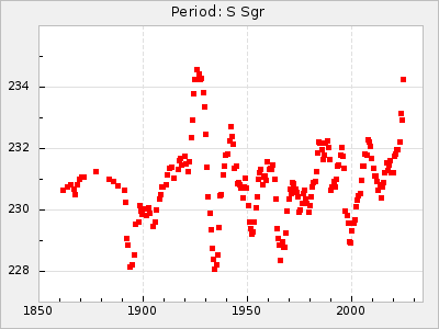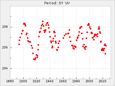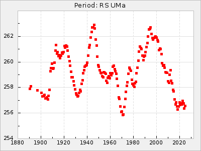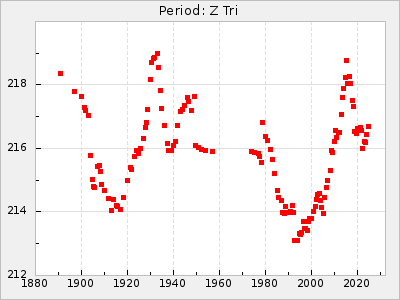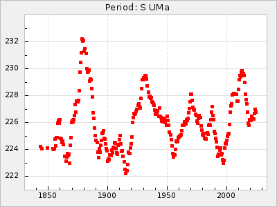 Mean period: 225.96, Mean epoch: 2445774.4 LC Avg Per ΔP: 0.09 ±0.02 (t:5.1, r2:0.085), ΔEpoch: -3.6 ΔP/C: 0 ±0 (t:0.6, r2:0.001) Mag at max: 7.9 ±0.1 (7.7-8.4) GCVS period: 225.87, GCVS epoch: 2445778 GCVS spectral type: S0,9e-S5,9e E/P (X=15) ε2: 37.2, 2a2: -67.7, r2: 0.958 E/P (X=5) ε2: 15.7, 2a2: 13.6, r2: 0.978 |