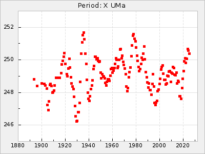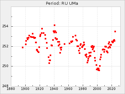 Mean period: 230.43, Mean epoch: 2442043.7 LC Avg Per ΔP: 0.97 ±0.02 (t:39.9, r2:0.883), ΔEpoch: 34.7 ΔP/C: 0.009 ±0.001 (t:13.9, r2:0.48) Mag at max: 8.1 ±0.4 (7.0-9.2) GCVS period: 229.46, GCVS epoch: 2442009 GCVS spectral type: M3e-M5(II)e E/P (X=15) ε2: 15.8, 2a2: 0.8, r2: 0.99 E/P (X=5) ε2: 11.7, 2a2: 12, r2: 0.926 |