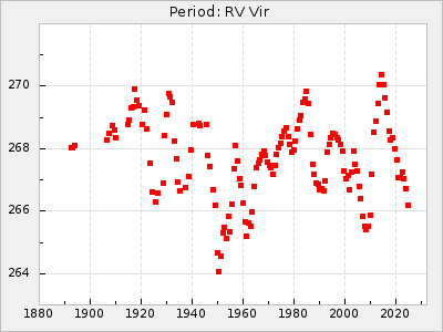 Mean period: 267.58, Mean epoch: 2440668.2 LC Avg Per ΔP: 1.71 ±0.02 (t:70.1, r2:0.972), ΔEpoch: 33.2 ΔP/C: -0.001 ±0.001 (t:1.1, r2:0.009) Mag at max: 11.3 ±0.5 (10.0-12.3) GCVS period: 265.87, GCVS epoch: 2440635 GCVS spectral type: M5e E/P (X=15) ε2: 7.1, 2a2: 42.5, r2: 0.811 E/P (X=5) ε2: 14.9, 2a2: 12.7, r2: 0.969 |