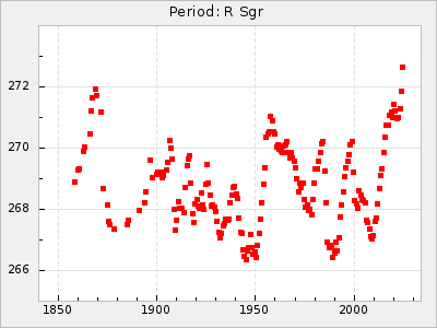 Mean period: 272.11, Mean epoch: 2440716.3 LC Avg Per ΔP: 0.41 ±0.03 (t:15, r2:0.609), ΔEpoch: 20.3 ΔP/C: -0.001 ±0.001 (t:0.9, r2:0.006) Mag at max: 9.3 ±0.5 (8.4-10.8) GCVS period: 271.7, GCVS epoch: 2440696 GCVS spectral type: M3e-M5IIe E/P (X=15) ε2: 17.7, 2a2: 28.6, r2: 0.978 E/P (X=5) ε2: 14.7, 2a2: 41.3, r2: 0.819 |