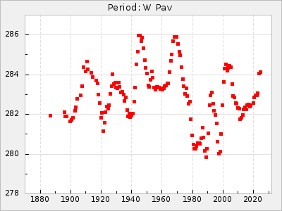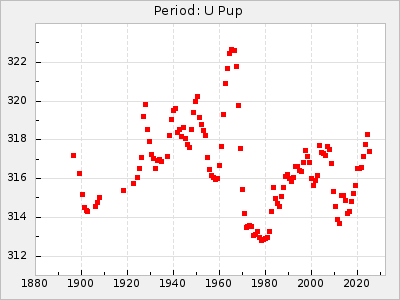 Mean period: 279.27, Mean epoch: 2445415.5 LC Avg Per ΔP: -2.18 ±0.03 (t:70.6, r2:0.966), ΔEpoch: -2.5 ΔP/C: 0.003 ±0.001 (t:2.7, r2:0.041) Mag at max: 6.2 ±0.3 (5.5-7.1) GCVS period: 281.45, GCVS epoch: 2445418 GCVS spectral type: M6II-IIIe-M9 E/P (X=15) ε2: 33.8, 2a2: -34.8, r2: 0.985 E/P (X=5) ε2: 20.5, 2a2: 12.6, r2: 0.985 |