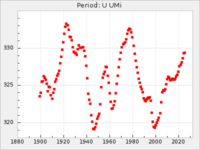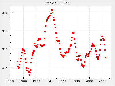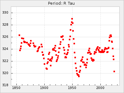 Mean period: 326.70, Mean epoch: 2445083.5 LC Avg Per ΔP: -8.1 ±0.09 (t:91.7, r2:0.984), ΔEpoch: -6.5 ΔP/C: 0.021 ±0.004 (t:4.7, r2:0.14) Mag at max: 8.5 ±0.3 (7.9-9.8) GCVS period: 334.8, GCVS epoch: 2445090 GCVS spectral type: M6e-M8.5e(Tc) E/P (X=15) ε2: 141.9, 2a2: -290.8, r2: 0.966 E/P (X=5) ε2: 82.3, 2a2: -52.5, r2: 0.981 |