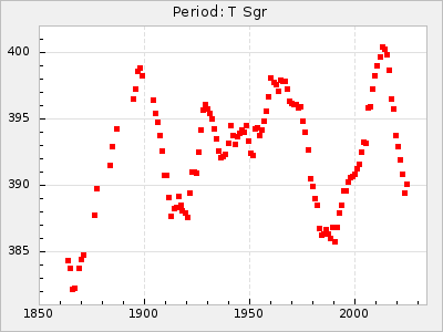 Mean period: 392.94, Mean epoch: 2444844.2 LC Avg Per ΔP: -1.72 ±0.08 (t:22.8, r2:0.803), ΔEpoch: -52.8 ΔP/C: 0.004 ±0.004 (t:1.1, r2:0.009) Mag at max: 8.2 ±0.3 (7.4-9.5) GCVS period: 394.66, GCVS epoch: 2444897 GCVS spectral type: S4.5,8e-S5.5,8e E/P (X=15) ε2: 121.9, 2a2: -125.7, r2: 0.985 E/P (X=5) ε2: 76.9, 2a2: 13.2, r2: 0.979 |