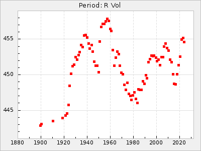 Mean period: 451.45, Mean epoch: 2442226.1 LC Avg Per ΔP: -2.15 ±0.14 (t:15.8, r2:0.744), ΔEpoch: -52.9 ΔP/C: -0.003 ±0.011 (t:0.3, r2:0.001) Mag at max: 10.6 ±0.9 (8.2-12.2) GCVS period: 453.6, GCVS epoch: 2442279 GCVS spectral type: C(N)e E/P (X=15) ε2: 70.7, 2a2: 49.2, r2: 0.952 E/P (X=5) ε2: 43.5, 2a2: 165.3, r2: 0.882 |